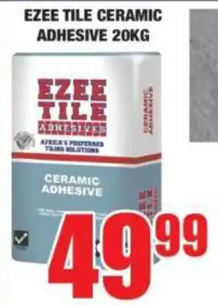 This special is available in various stores, view all products to get the cheapest Ezee tile ceramic adhesive. If you'd like to find out whether this product has a bigger discount in another store, check the category 'Grocery stores'. You may also find these specials interesting: Ezee tile ceramic adhesive, Build It Ceramic Tile Adhesive & Ceramic Tile Cement-20Kg.