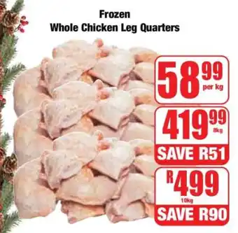This special is available in various stores, view all products to get the cheapest Frozen Whole Chicken Leg Quarters. If you'd like to find out whether this product has a bigger discount in another store, check the category 'Grocery stores'. You may also find these specials interesting: Frozen Whole Chicken Leg Quarters, Frozen Whole Chicken Leg Quarters 4kg & HINDS Spice Assorted (All Sizes) & no name Frozen Chicken Leg Quarters 3.5kg.