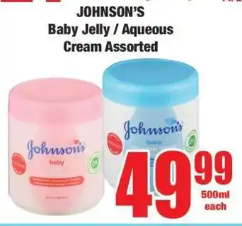 This special is available in various stores, view all products to get the cheapest JOHNSON'S Baby Jelly / Aqueous Cream Assorted. If you'd like to find out whether this product has a bigger discount in another store, check the category 'Grocery stores'. You may also find these specials interesting: JOHNSON'S Baby Jelly/ Aqueous Cream Assorted, Johnson's Baby Aqueous Cream or Jelly Assorted & Johnson's Baby Aqueous Cream or Baby Jelly Assorted 500ml Each.