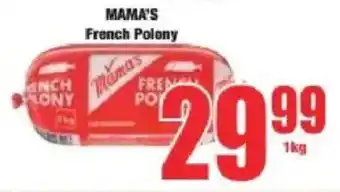 This special is available in various stores, view all products to get the cheapest MAMA'S French Polony. If you'd like to find out whether this product has a bigger discount in another store, check the category 'Grocery stores'. You may also find these specials interesting: MAMA'S French Polony, Champion french polony & RENOWN FRENCH POLONY 2kg each.
