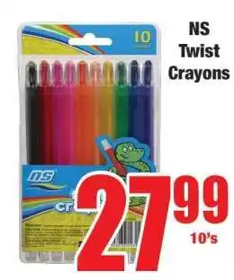 This special is available in various stores, view all products to get the cheapest NS Twist Crayons. If you'd like to find out whether this product has a bigger discount in another store, check the category 'Grocery stores'. You may also find these specials interesting: NS Twist Crayons, EDU-MAX Twist Crayons & Meeco Twist Crayons Assorted.