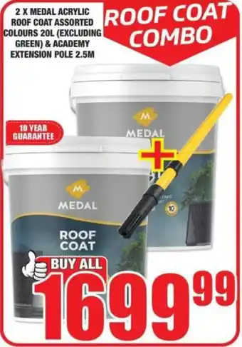2 X MEDAL ACRYLIC ROOF COAT ASSORTED COLOURS 20L EXCLUDING GREEN & ACADEMY EXTENSION POLE 2.5M