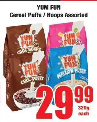 YUM FUN Cereal Puffs / Hoops Assorted promotion at Boxer