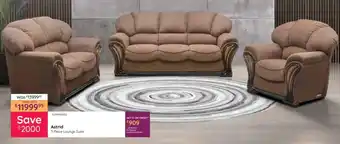 This special is available in various stores, view all products to get the cheapest Astrid Lounge Suite. If you'd like to find out whether this product has a bigger discount in another store, check the category 'Home furniture'. You may also find these specials interesting: Astrid 3 Piece Lounge Suite 10299189002, Wisteria lounge suite & Otto lounge suite.