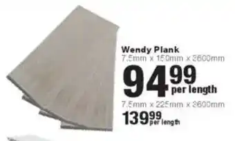 This special is available in various stores, view all products to get the cheapest Wendy Plank. If you'd like to find out whether this product has a bigger discount in another store, check the category 'DIY & Garden'. You may also find these specials interesting: Grocery Cupboard 600mm White 81496764, Vilanc Beach Front Scatter Cushion 50 x 50 81502914 & Micro Flexible Pipe 5mm x 10m (393458).