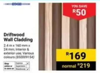 Builders Express offers a wide collection of products, besides the Driftwood Wall Cladding. Keep an eye on the weekly Builders Express catalogue to find the best specials and promotions. Besides Driftwood Wall Cladding, you can also find the following offers: Driftwood Wall Cladding 2.4m X 160mm X 24mm 850009154, Edge Driftwood Wall Cladding & Wall cladding panels.