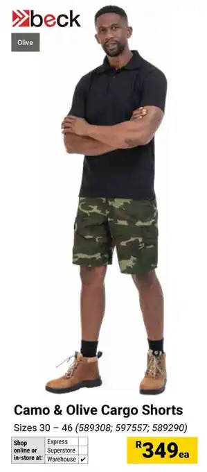 Now on special at Builders Warehouse: Beck Camo & Olive Cargo Shorts ✅ Valid from 14-10 to 13-01.