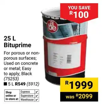 This special is available in various stores, view all products to get the cheapest Bituprime. If you'd like to find out whether this product has a bigger discount in another store, check the category 'DIY & Garden'. You may also find these specials interesting: Abe 25L Bituprime, offer 2 & offer 3.