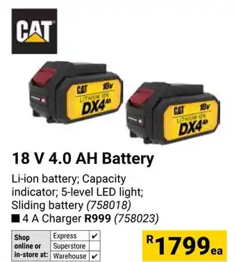 CAT 18 V 4.0 AH Battery promotion at Builders Warehouse