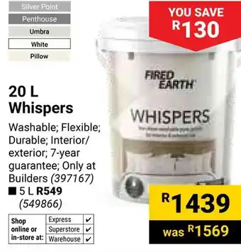 Builders Warehouse offers a wide collection of products, besides the Fired Earth Whispers. Keep an eye on the weekly Builders Warehouse catalogue to find the best specials and promotions. Besides Fired Earth Whispers, you can also find the following offers: Fired Earth Whispers 397167-20Ltr, Fired Earth Whispers & Fired Earth 20L Whispers (755614).