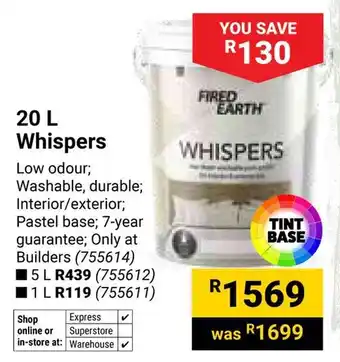 Builders Warehouse offers a wide collection of products, besides the Fired Earth Whispers. Keep an eye on the weekly Builders Warehouse catalogue to find the best specials and promotions. Besides Fired Earth Whispers, you can also find the following offers: Fired Earth Whispers 397167-20Ltr, Fired Earth Whispers & Fired Earth 20L Whispers (755614).