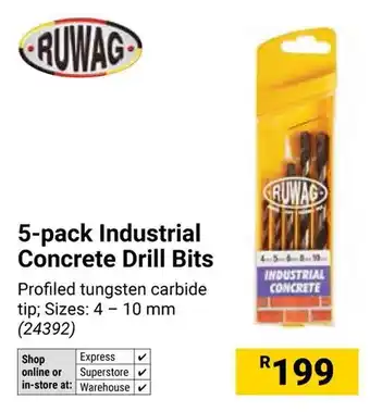 The RUWAG Industrial Concrete Drill Bits is now available with a discount at Builders Warehouse. On this page, you’ll find everything about the current price, promotion conditions, and how long the offer is valid. Also explore other offers and promotions for RUWAG Industrial Concrete Drill Bits to make a smart and cost-effective choice.