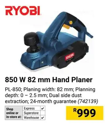 Now on special at Builders Warehouse: RYOBI 850 W 82 mm Hand Planer ✅ Valid from 14-10 to 13-01.