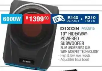 This special is available in various stores, view all products to get the cheapest Dixon 10" hideaway-powered subwoofer. If you'd like to find out whether this product has a bigger discount in another store, check the category 'Electronics'. You may also find these specials interesting: Dixon 3.1-channel soundbar & 6.5" wired subwoofer, Dixon 2.1-channel soundbar & 5.25" wireless subwoofer & Dixon 2.1-channel soundbar & 6.5" wired subwoofer.