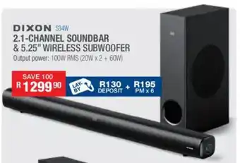 This Dixon 2.1-channel soundbar & 5.25" wireless subwoofer is available in the following branches based on your set location: