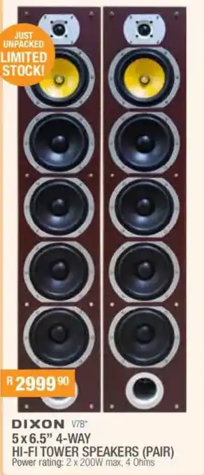 Dixon 5x6.5" 4-way hi-fi tower speakers promotion at Cash Crusaders