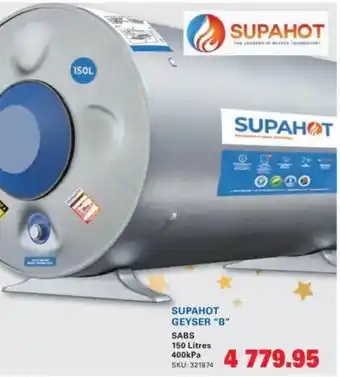 This special is available in various stores, view all products to get the cheapest Supahot geyser "B". If you'd like to find out whether this product has a bigger discount in another store, check the category 'DIY & Garden'. You may also find these specials interesting: Kwikot 150L Geyser Class B Energy Rating 81424751, Geyser 200lt & Geyser 100lt.