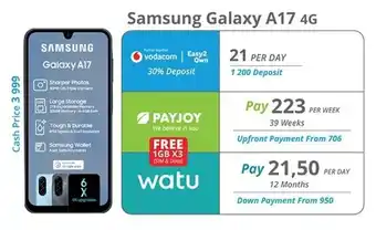 This special is available in various stores, view all products to get the cheapest Samsung Galaxy A17 4G. If you'd like to find out whether this product has a bigger discount in another store, check the category 'Electronics'. You may also find these specials interesting: Samsung Galaxy A36 5G, Samsung Galaxy A36 5G & Samsung Galaxy A06.