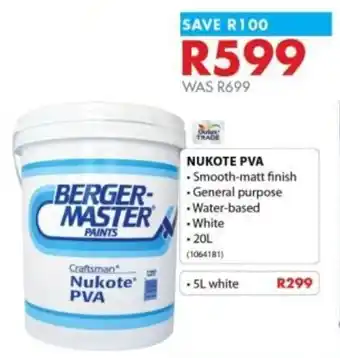 This special is available in various stores, view all products to get the cheapest Berger-master Nukote PVA. If you'd like to find out whether this product has a bigger discount in another store, check the category 'DIY & Garden'. You may also find these specials interesting: Berger Master 20L Nukote PVA, Berger Master 20L Nukote & Dulux Nukote PVA 48544-20L.