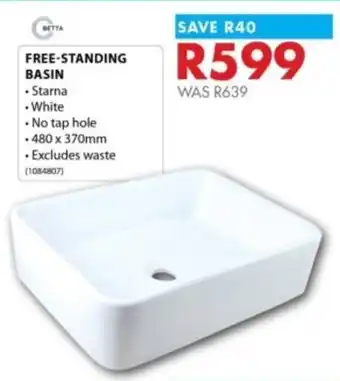 This special is available in various stores, view all products to get the cheapest Betta free-standing basin. If you'd like to find out whether this product has a bigger discount in another store, check the category 'DIY & Garden'. You may also find these specials interesting: Moretta Free-standing Basin, Talia Free-standing Basin & Splashworks free-standing basin.
