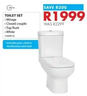 This Betta toilet set is currently available as part of a special promotion at Chamberlain. Be sure to check the current promotions filled with competitive prices and deals. You can order Betta toilet set online via Chamberlain website or get it at the best available price. Cataloguespecials.co.za collects the most relevant Betta toilet set offers and specials for you. Want to be notified first? Click the bell icon to receive a free alert when the product is part of a new promotion or available again.