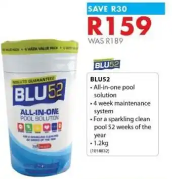 This special is available in various stores, view all products to get the cheapest BLU52. If you'd like to find out whether this product has a bigger discount in another store, check the category 'DIY & Garden'. You may also find these specials interesting: BLU52 Active Algaecide 550467-2Ltr, BLU52 Granular Chlorine 670325-10kg & BLU52 Granular Chlorine 784511-25kg.