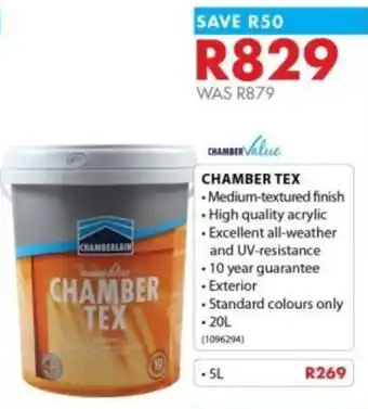 This special is available in various stores, view all products to get the cheapest Chamber value chamber tex. If you'd like to find out whether this product has a bigger discount in another store, check the category 'DIY & Garden'. You may also find these specials interesting: Chamber value chamber pave, Chamber value chamber matt & Chamber value chamber roof.