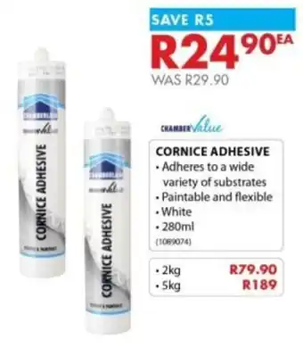 Chamberlain offers a wide collection of products, besides the Chamber value cornice adhesive. Keep an eye on the weekly Chamberlain catalogue to find the best specials and promotions. Besides Chamber value cornice adhesive, you can also find the following offers: Chamber value 12 set tile adhesive, Chamber value ceramic tile adhesive & Alcolin Cornice Adhesive.
