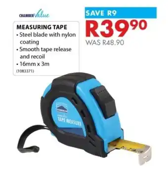 This special is available in various stores, view all products to get the cheapest Chamber Value Measuring Tape. If you'd like to find out whether this product has a bigger discount in another store, check the category 'DIY & Garden'. You may also find these specials interesting: Chamber Value Plaster Trowel, Chamber Value Club Hammer & Bostik Clear Tape Value Pack.