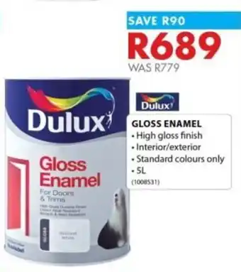 This special is available in various stores, view all products to get the cheapest Dulux Gloss Enamel. If you'd like to find out whether this product has a bigger discount in another store, check the category 'DIY & Garden'. You may also find these specials interesting: Dulux 5L Brilliant White Gloss Enamel, Dulux Brilliant White Gloss Enamel & Plascon 5L Super Gloss Enamel.