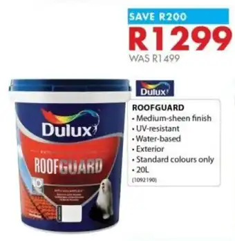 This special is available in various stores, view all products to get the cheapest Dulux Roofguard. If you'd like to find out whether this product has a bigger discount in another store, check the category 'DIY & Garden'. You may also find these specials interesting: Dulux Weatherguard, Dulux Gloss Enamel & Dulux Weatherguard-20L.