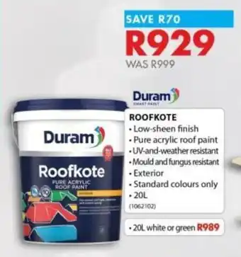 This special is available in various stores, view all products to get the cheapest Duram Roofkote. If you'd like to find out whether this product has a bigger discount in another store, check the category 'DIY & Garden'. You may also find these specials interesting: Duram Nuglo, Duram Nuglo & Duram Armaguard.