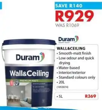 This special is available in various stores, view all products to get the cheapest Duram wall&ceiling. If you'd like to find out whether this product has a bigger discount in another store, check the category 'DIY & Garden'. You may also find these specials interesting: Duram Wall Sheen, Duram Nuglo & Duram Nuglo.