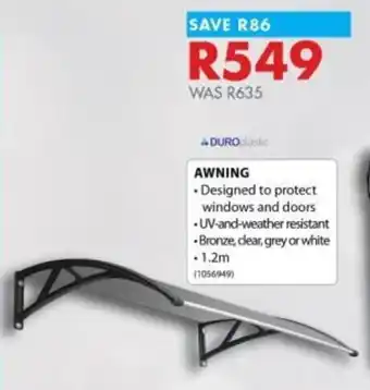 This special is available in various stores, view all products to get the cheapest Duro plastic awning. If you'd like to find out whether this product has a bigger discount in another store, check the category 'DIY & Garden'. You may also find these specials interesting: Door Awning 1m x 700mm 32692, Swartland COL Awning & Plastic ball.