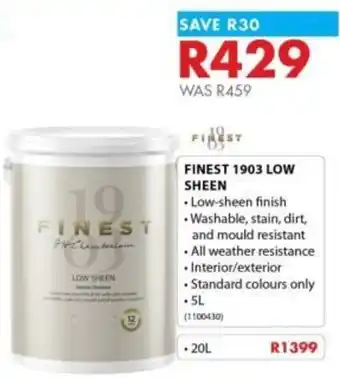 This special is available in various stores, view all products to get the cheapest Finest 1903 low sheen. If you'd like to find out whether this product has a bigger discount in another store, check the category 'DIY & Garden'. You may also find these specials interesting: Finest 1903 sheen, Finest 1903 textured sheen & Chamber value chamber low sheen.