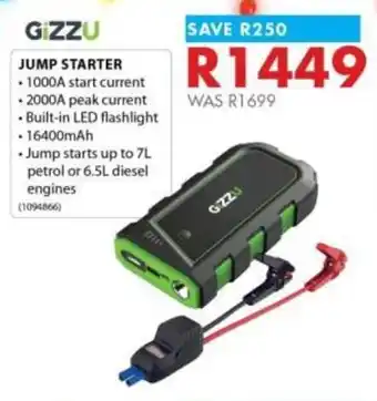 This Gizzu jump starter is currently available as part of a special promotion at Chamberlain. Be sure to check the current promotions filled with competitive prices and deals. You can order Gizzu jump starter online via Chamberlain website or get it at the best available price. Cataloguespecials.co.za collects the most relevant Gizzu jump starter offers and specials for you. Want to be notified first? Click the bell icon to receive a free alert when the product is part of a new promotion or available again.