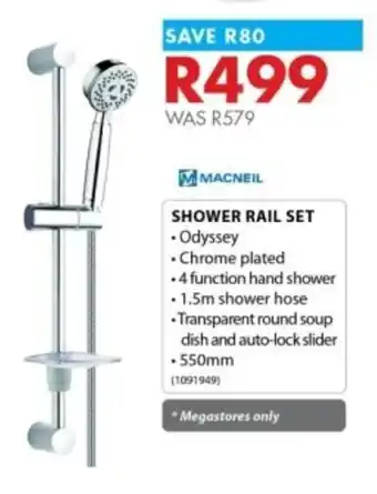 This special is available in various stores, view all products to get the cheapest Macneil shower rail set. If you'd like to find out whether this product has a bigger discount in another store, check the category 'DIY & Garden'. You may also find these specials interesting: Gedore Socket on Rail Set, Shower set & Gedore 12 Piece 12.7mm (1/2) Socket On Rail Set.