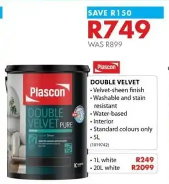 This special is available in various stores, view all products to get the cheapest Plascon Double Velvet. If you'd like to find out whether this product has a bigger discount in another store, check the category 'DIY & Garden'. You may also find these specials interesting: Plascon Double Velvet, Plascon 20L Double Velvet (26131) & Plascon 20L Double Velvet.