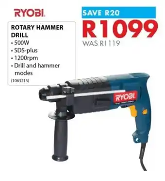 This special is available in various stores, view all products to get the cheapest Ryobi Rotary Hammer Drill. If you'd like to find out whether this product has a bigger discount in another store, check the category 'DIY & Garden'. You may also find these specials interesting: Ryobi 1250W Rotary Hammer Drill (744608), Ryobi 500W 20mm SDS Plus Rotary Hammer Drill ED-500 (585530) & Makita 710W 22mm SDS Plus Rotary Hammer (605132).