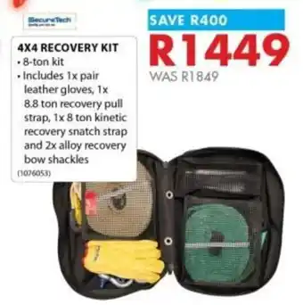 This special is available in various stores, view all products to get the cheapest SecureTech 4x4 recovery kit. If you'd like to find out whether this product has a bigger discount in another store, check the category 'DIY & Garden'. You may also find these specials interesting: First Choice High Protein Recovery Milk, First Choice High Protein Recovery Milk Asstd. & RYOBI KIT-488.