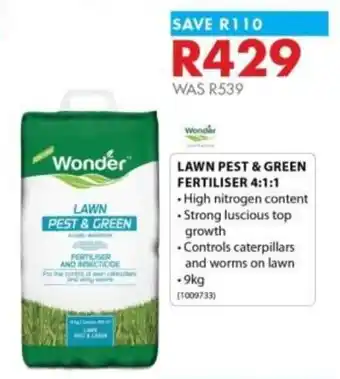 This special is available in various stores, view all products to get the cheapest Wonder lawn pest & green fertiliser 4:1:1. If you'd like to find out whether this product has a bigger discount in another store, check the category 'DIY & Garden'. You may also find these specials interesting: Wonder Fertiliser 7:1:3, Wonder Fertiliser 2:3:2 & Wonder 10Kg All Purpose Fertiliser (18970).