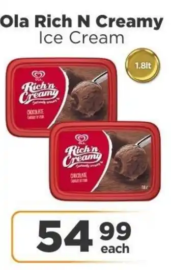 This special is available in various stores, view all products to get the cheapest Ola Rich N Creamy Ice Cream. If you'd like to find out whether this product has a bigger discount in another store, check the category 'Grocery stores'. You may also find these specials interesting: OLA RICH 'N CREAMY ICE CREAM all variants, Ola Rich ‘n Creamy Ice Cream Assorted 1.8 Litre Each & Ola Magnum Ice Cream Stick.