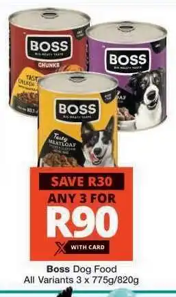 Checkers offers a wide collection of products, besides the BOSS DOG FOOD. Keep an eye on the weekly Checkers catalogue to find the best specials and promotions. Besides BOSS DOG FOOD, you can also find the following offers: Boss Wet or Mighty Chunks Dog Food Asstd., EPOL DOG FOOD & Bobtail Dog Food.