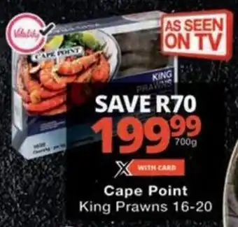 This special is available in various stores, view all products to get the cheapest Cape Point King Prawns. If you'd like to find out whether this product has a bigger discount in another store, check the category 'Grocery stores'. You may also find these specials interesting: Cape Point Frozen Vannamei Queen Prawns, Cape Point Whole Platter/ Queen Prawns/ Prawn Meat & Cape Point Frozen Braai Snoek.