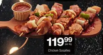 This special is available in various stores, view all products to get the cheapest Chicken Sosaties. If you'd like to find out whether this product has a bigger discount in another store, check the category 'Grocery stores'. You may also find these specials interesting: Chicken Sosaties, Chicken Thigh Sosaties Assorted & Chicken Thigh Sosaties Assorted-Per Kg.
