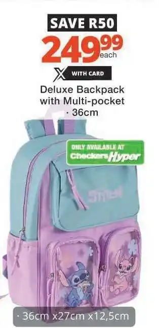 Checkers offers a wide collection of products, besides the Deluxe Backpack with Multi-pocket. Keep an eye on the weekly Checkers catalogue to find the best specials and promotions. Besides Deluxe Backpack with Multi-pocket, you can also find the following offers: Deluxe Backpack with Multi-pocket, Large Deluxe Multi-pocket Backpack Assorted Designs Each & Large 3D Multi-pocket Backpack.