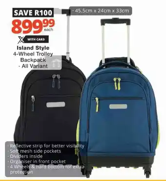 Now on special at Checkers: Island Style 4-Wheel Trolley Backpack ✅ Valid from 29-12 to 8-02.