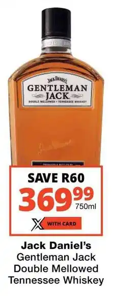 The Jack Daniel's Gentleman Jack Double Mellowed Tennessee Whiskey is available this week at Checkers as part of a special promotion. On this page, you’ll find everything about the promotional price, terms, and current specials. Browse related promotions and offers for Jack Daniel's Gentleman Jack Double Mellowed Tennessee Whiskey to make sure you don’t miss out.