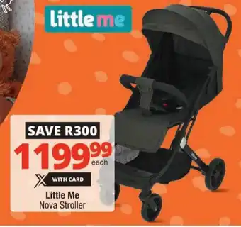 The price of Little Me Nova Stroller can be found at the top of the page, together with the dates during which the special is available. You can also check the price in the current Checkers catalogue or on the Checkers website. Promotional offers assure you of buying Checkers products at the lowest price.