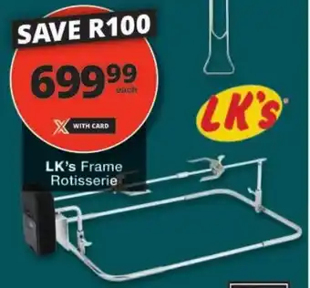 The LK's Frame Rotisserie is now available with a discount at Checkers. On this page, you’ll find everything about the current price, promotion conditions, and how long the offer is valid. Also explore other offers and promotions for LK's Frame Rotisserie to make a smart and cost-effective choice.